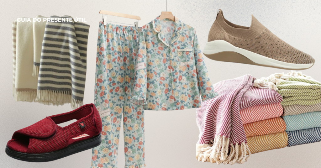 Roupas a acessórios feitas com tecidos macios, de boa qualidade e com modelagem confortável costumam agradar bastante. Cachecóis, mantas leves ou pijamas são opções que transmitem cuidado e aconchego.